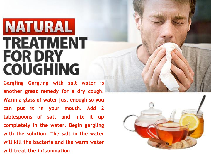 Gargling Gargling with salt water is another great remedy for a dry cough. Warm a glass of water just enough so you can put it in your mouth. Add 2 tablespoons of salt and mix it up completely in the water. Begin gargling with the solution. The salt in the water will kill the bacteria and the warm water will treat the inflammation.